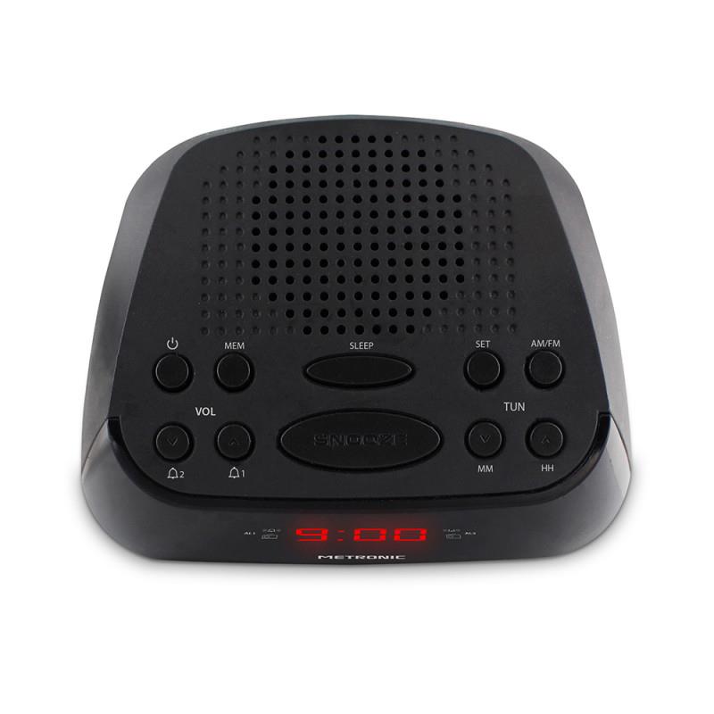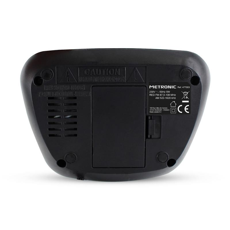 Características Técnicas: Sintonizador digital FM ,10 estações de memória, Dois alarmes independentes (Campainha e alarmes de rádio), Função dormir: desligamento automático do rádio,Display LED vermelho,Coluna Som: 0,5 W,Fonte de alimentação: 230V ~ 50Hz / 2 pilhas AAA de emergência (não incluídas),Consumo: 5W ligado.